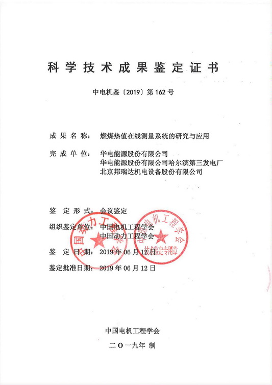 2019年6月12日,中國電機工程學會和中國動力工程學會在北京聯(lián)合組織召開了燃煤熱值在線測量系統(tǒng)的研究與應用項目技術鑒定會。
