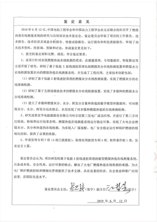 鑒定委員會認為:項目研發(fā)的基于低能X射線透射原理的新型燃煤熱值在線測量系統(tǒng),具備成本低、安全性高、運行可靠的特點,解決了火電廠燃煤熱值在線檢測的難題,為火電廠鍋爐燃燒控制和精細化管理提供了技術支撐,具有顯著的經(jīng)濟、社會效益和推廣應用前景,居國際先進水平。